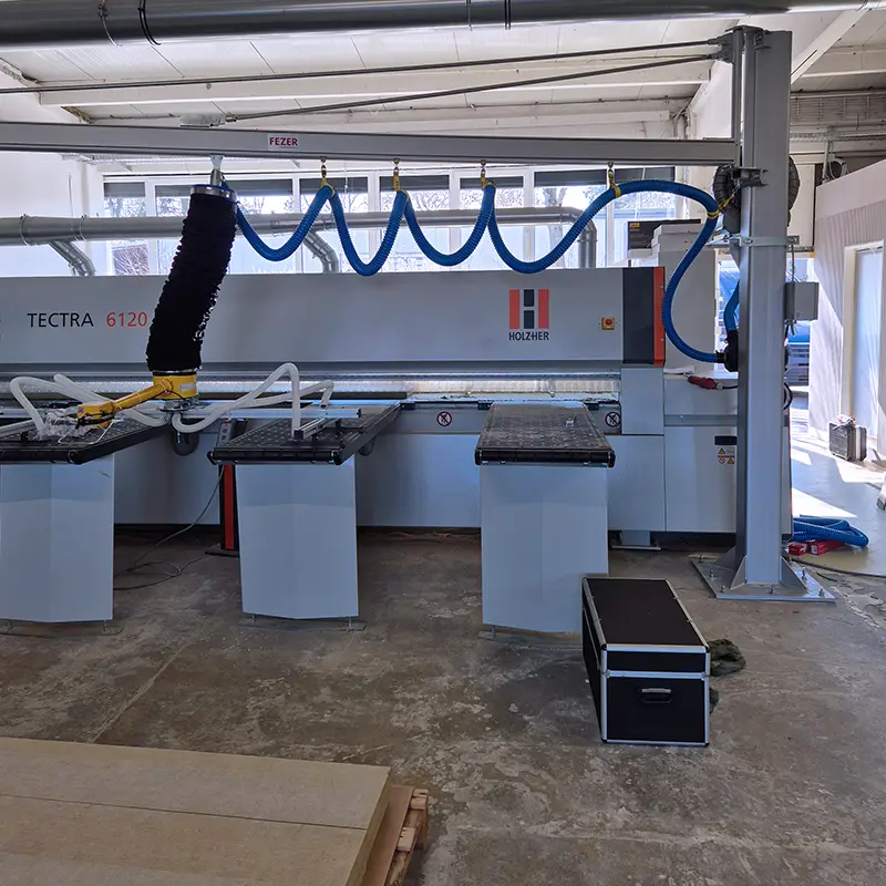 An overhead crane combined with a vacuum lifter provides an almost effortless way to move heavy sheet materials across a large working area. With no obstructing columns or floor elements, everything is suspended from the ceiling, allowing maximum freedom of movement.
